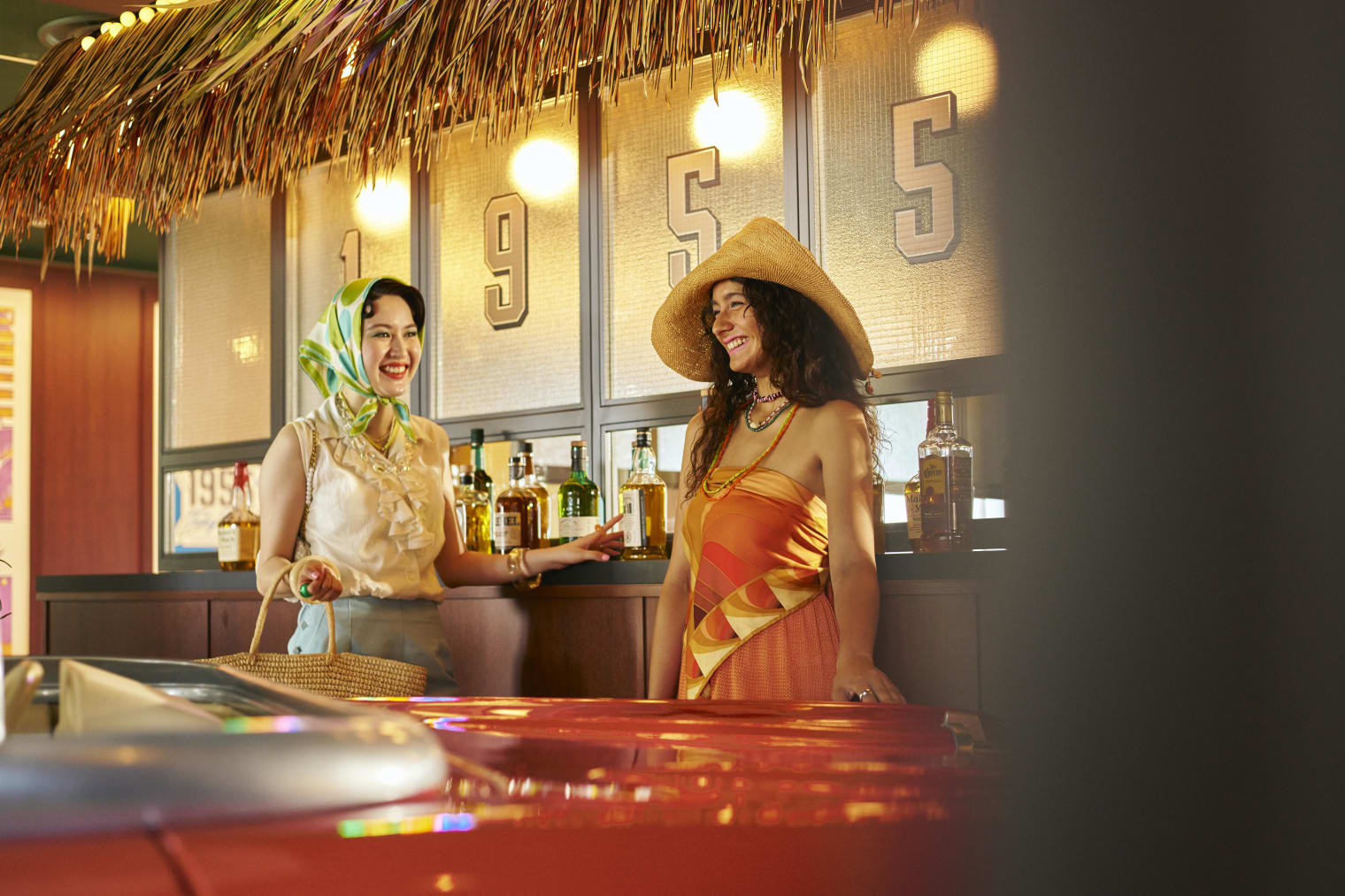 以当时开车去冲浪的休闲生活为灵感,现场布置了老爷车与冲浪板,Tiki酒吧风格的柜台更增添了复古氛围。