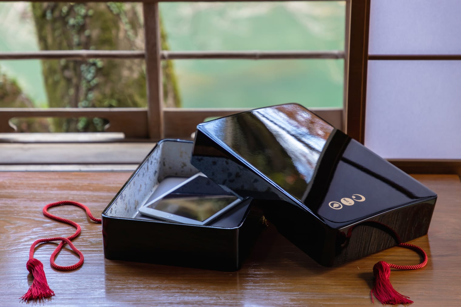 乘坐专用船前往虹夕诺雅 京都。远离喧嚣,忘却日常。入住时,将数码产品放入涂有描金画的漆盒中,直到退房为止都会妥善保管。
