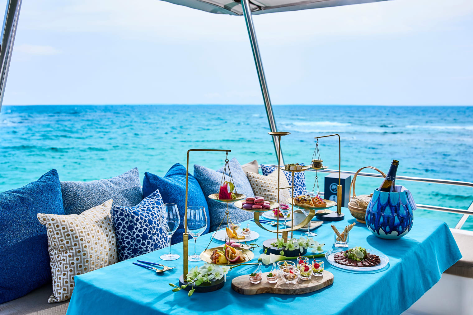 从机场附近的港口乘坐私家游艇,在船上休息室度过优雅的时光。