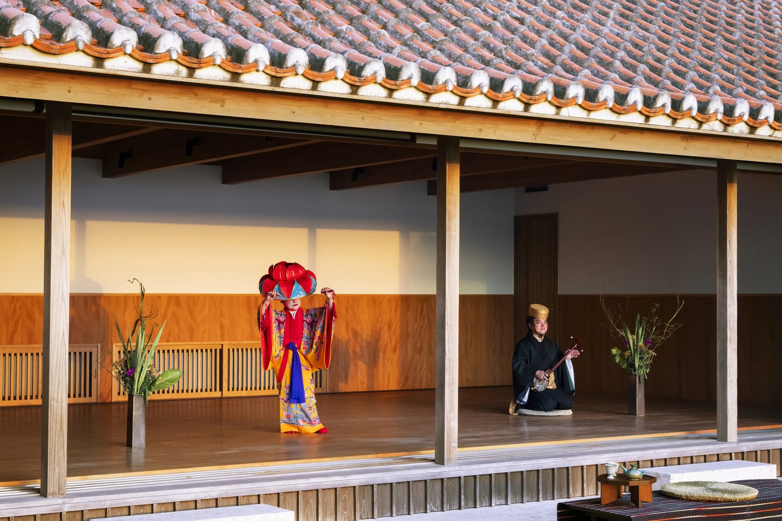 在虹夕諾雅 沖繩,您可以欣赏仿照首里城宴会、以“御庭”为舞台的琉球宫廷演艺。 您还能使用当时的酒器品尝历史悠久的泡盛,沉浸于怀古的奢华时光。