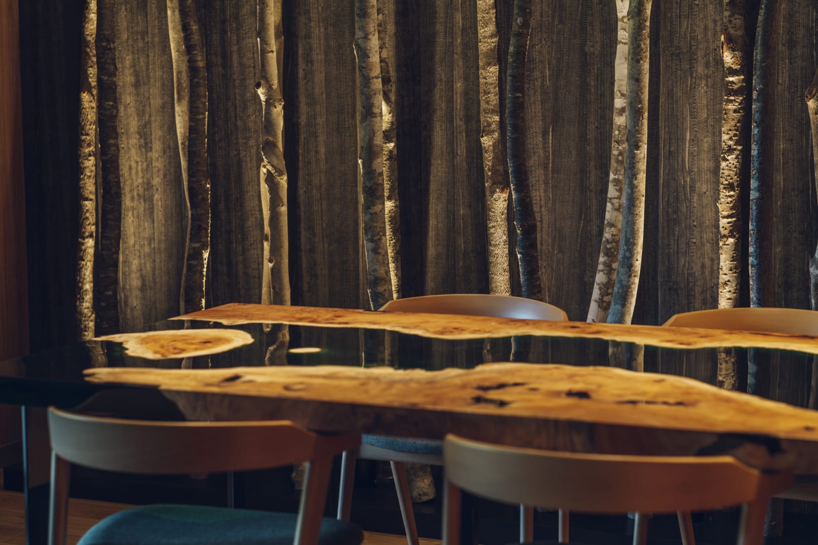 在法式餐厅中,一餐珍馐始于伴随着夕阳下清澈溪流的餐前酒。融入了大自然和时令食材的料理与名酒堪称绝配。在装饰着苹果的自助餐厅中,独特的菜肴定会让您感到兴奋。开放式厨房中现场烤制的苹果派堪称一绝。