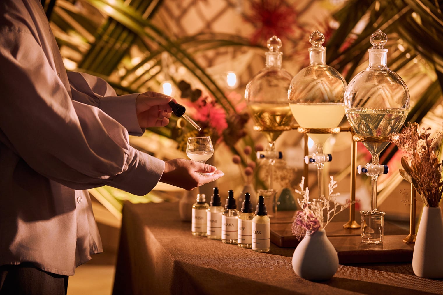 您可以在基础芳香中调合5种不同的香气,享受制作专属香氛喷雾的乐趣。将完成的香氛轻轻喷洒在干花或枕头上,整个房间便会充满柔和的香气。剩下的香氛喷雾不妨带回家中,沉浸在旅途的余韵里。