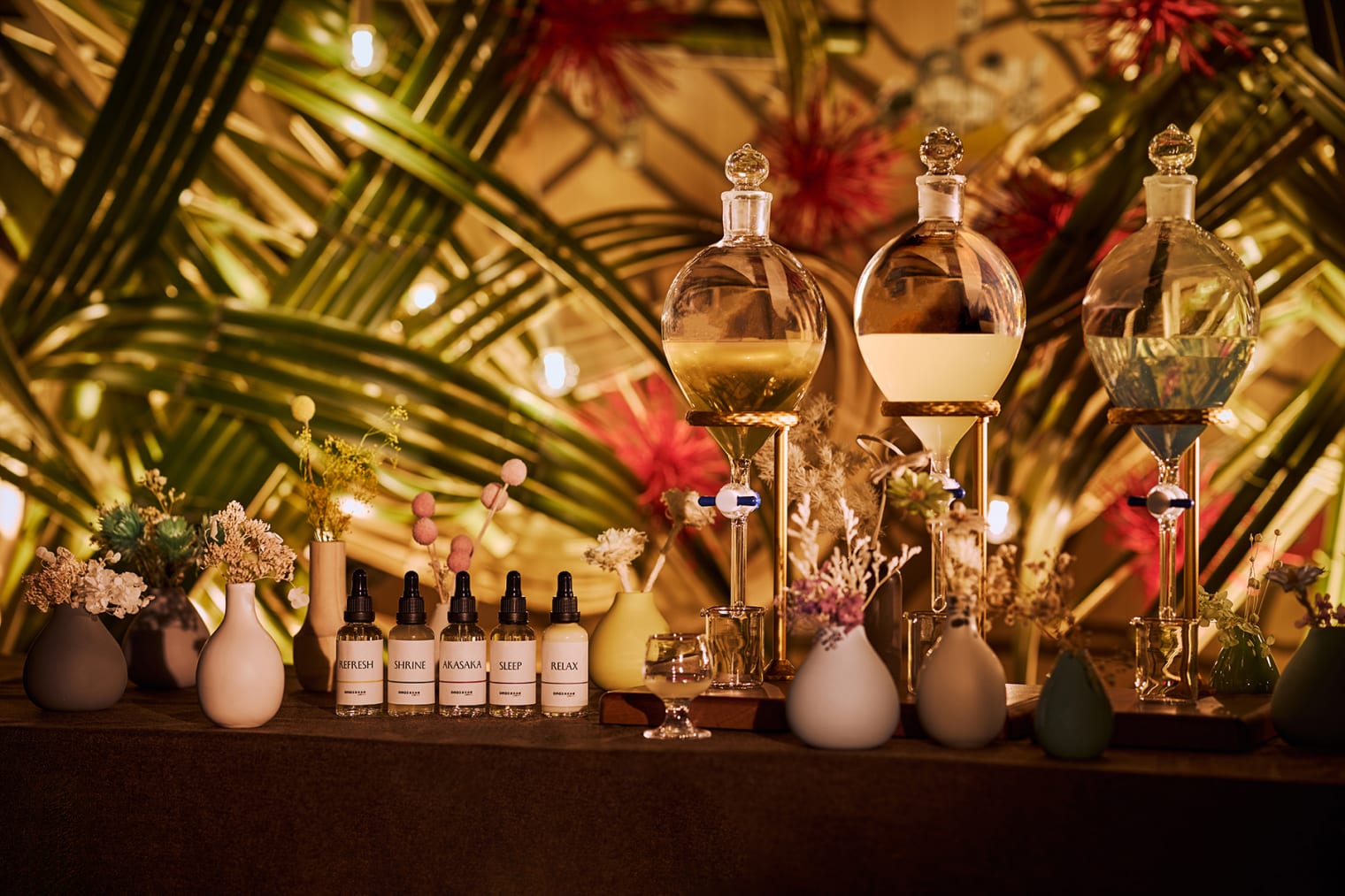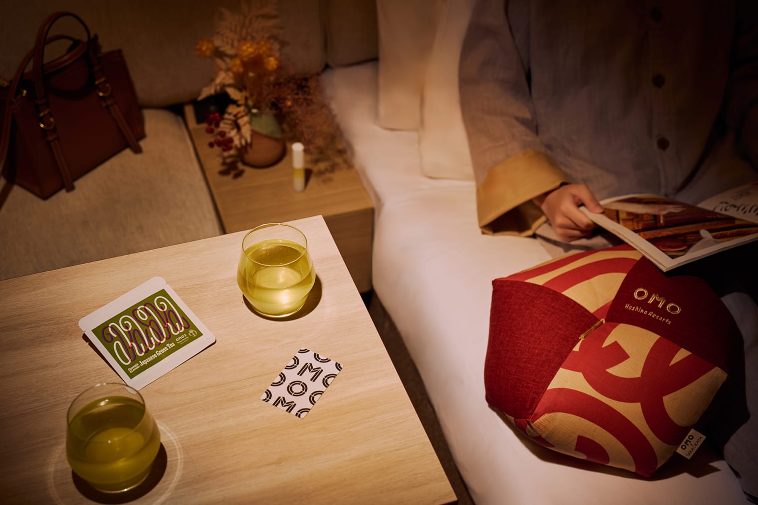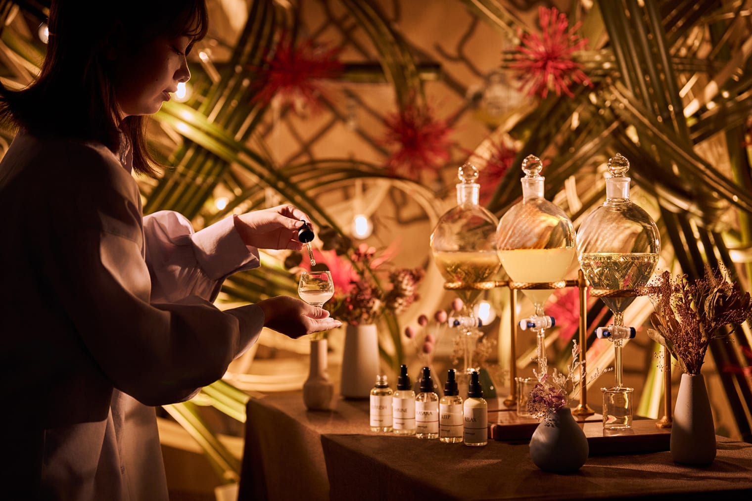 在日本三大花道流派之一“草月流”的动感花道作品所装点的空间里,我们提供可根据当日心情调配香氛的体验。备有赤坂老字号茶铺“土桥园”的混合香草煎茶,以及香气华丽的沐浴盐,为您营造一个安心舒缓的夜晚。