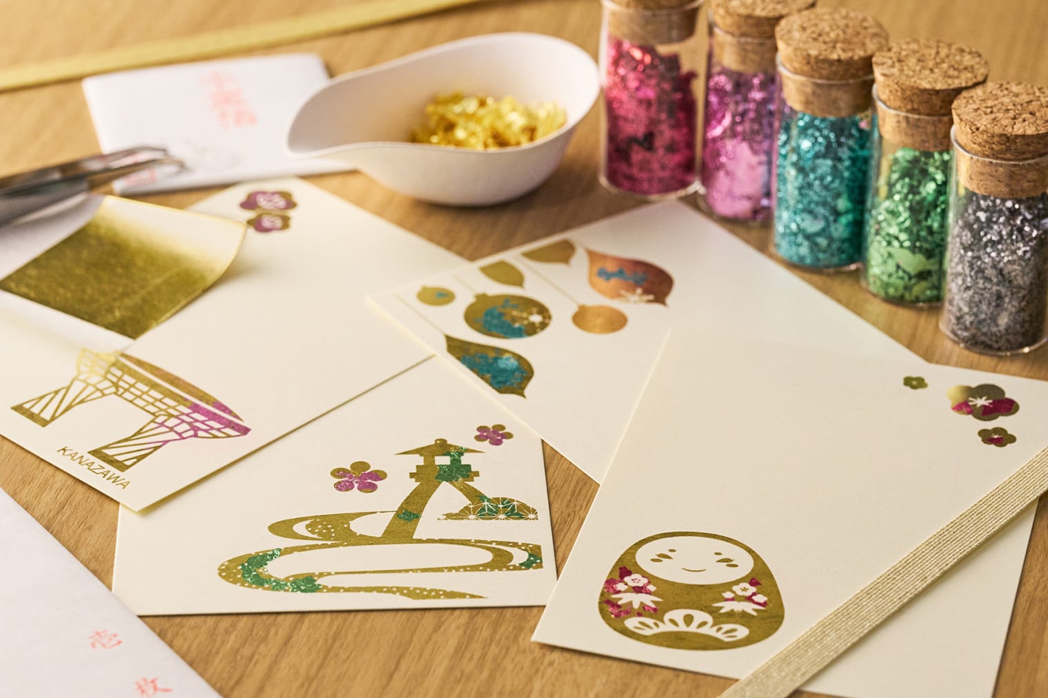 选择自己喜欢的设计的明信片,将金色和喜欢的色箔自由搭配粘贴的话,就能完成世界上独一无二的金箔纸!完成的东西可以带回去作为旅行的回忆,也可以当场写信享受