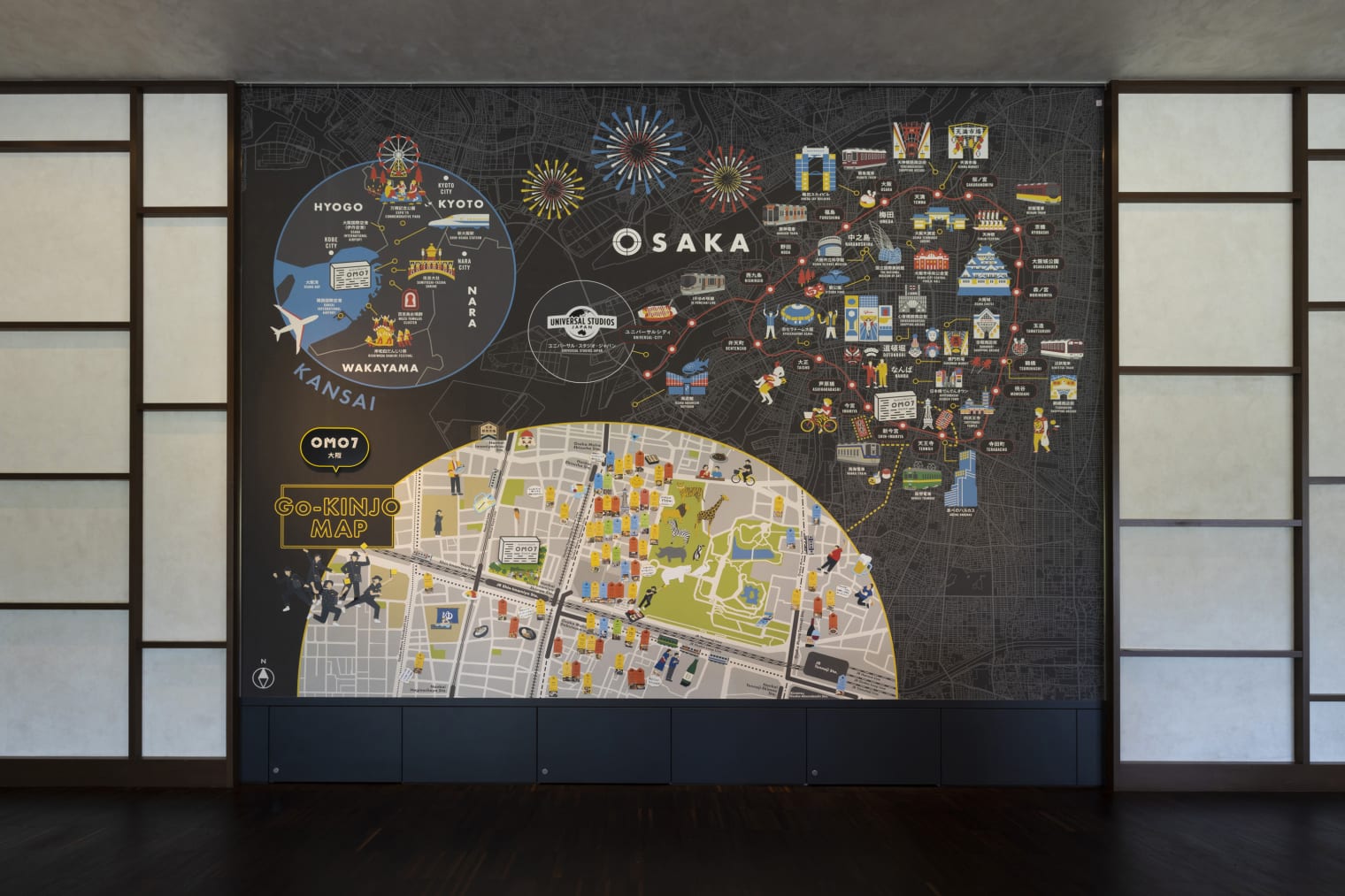 穿过公共空间入口的 OMO 大门,就会看见宽约6米,高约4米的"巨大 OSAKA (大阪)信息板"。