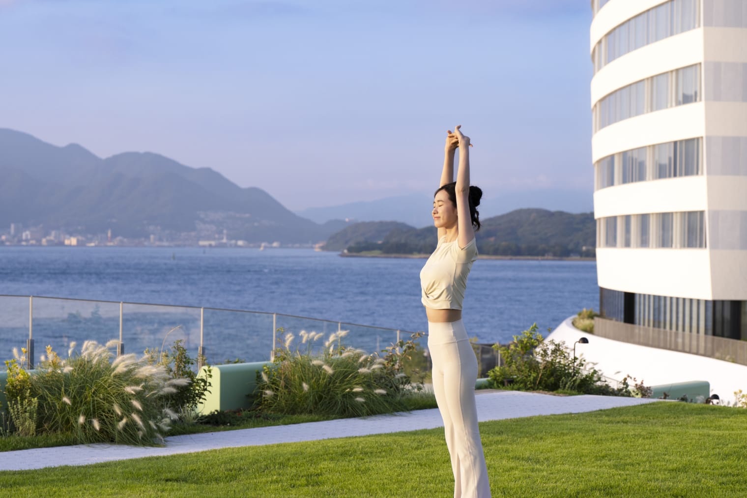 眺望着被旭日染红的关门海峡,在感受海风的同时深呼吸并伸展身体。让您迎来一个清爽的美好早晨。