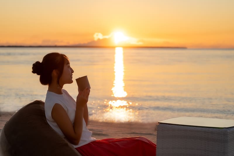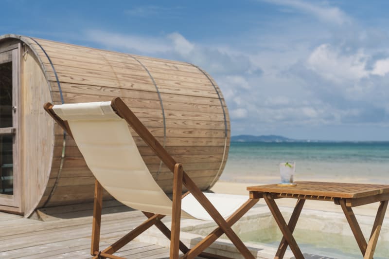 佇立在海灘上的桶狀桑拿,被南國風格的清爽的香味包圍著,可以在眼前體驗珊瑚礁創造出的絕景